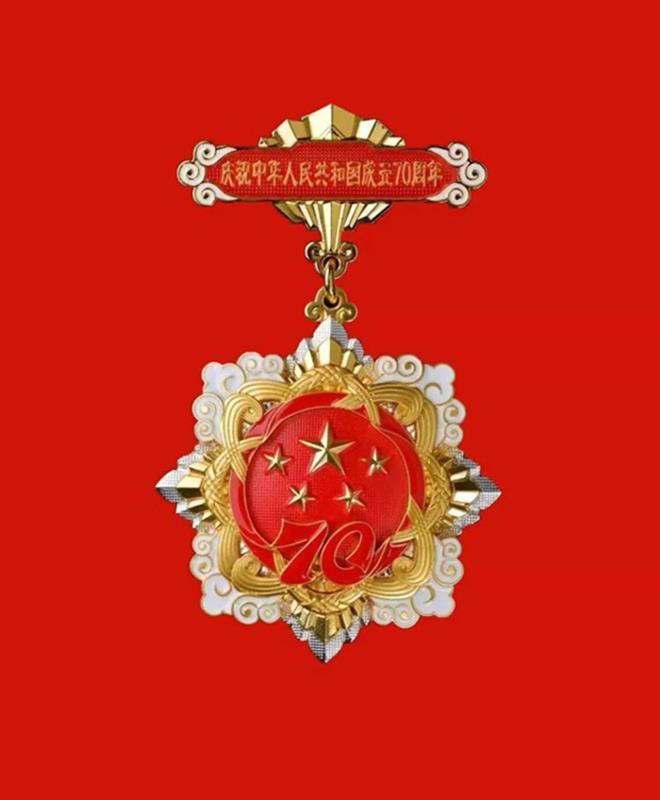 紀(jì)念章使用銅胎鍍金材質(zhì),通徑為50毫米,主要元素為五星、“70”飄帶、團錦結(jié)、如意祥云和光芒,主色調(diào)為紅色和金色。核心部分為五星,代表國家榮譽?!?0”飄帶象征中華人民共和國70年奮斗歷程。團錦結(jié)環(huán)繞在五星和“70”飄帶周圍,寓意全國各族人民大團結(jié),構(gòu)建人類命運共同體的愿景。章體外環(huán)以如意祥云、光芒構(gòu)成,象征人民對美好生活的向往,同時表達隆重慶祝中華人民共和國生日,禮贊國家富強、民族振興、人民幸福的輝煌成就,以及在70年輝煌奮斗成就的基礎(chǔ)上不忘初心、繼續(xù)前進的堅定決心。