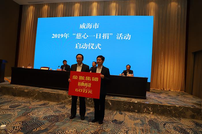2019年11月1日,威海市2019年“慈心一日捐”活動(dòng)啟動(dòng)儀式在東山賓館舉行,集團(tuán)公司紀(jì)委書記、工會(huì)主席鄒曉伍代表金猴集團(tuán)向市慈善總會(huì)捐款60萬元。