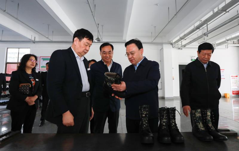 市委副書記、代市長閆劍波(右二)在集團黨委書記、董事長柳富林(右四)的陪同下視察鞋業(yè)生產(chǎn)車間
