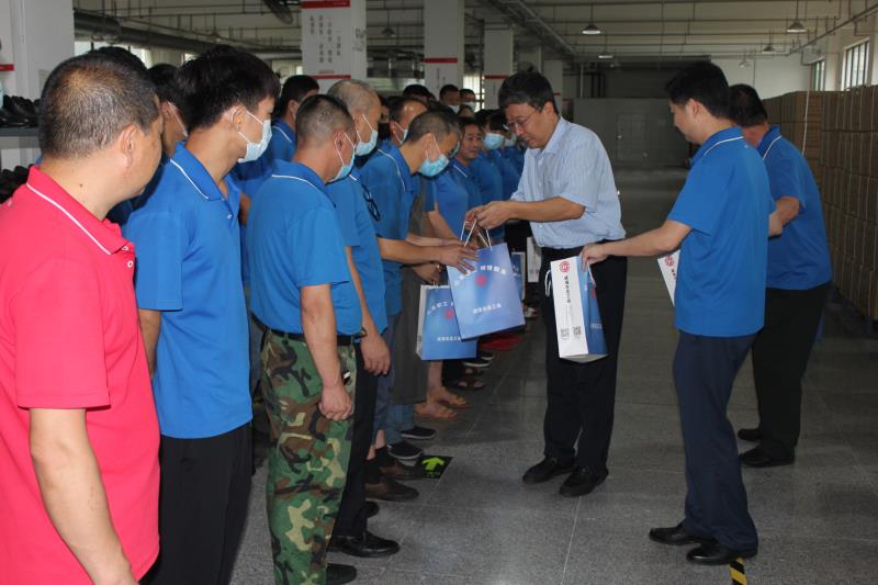 8月7日,威海市總工會黨組成員、經(jīng)審會主任王慶文、辦公室主任趙旭剛在集團公司工會主席鄒曉伍的陪同下,冒著酷暑高溫走進鞋業(yè)公司制鞋七車間,為正在趕制火箭軍專用作戰(zhàn)防護靴等軍品訂單的一線職工送去茶葉、洗化套裝等防暑降溫用品,以表達工會組織對廣大職工的貼心關懷。