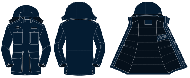 2、領(lǐng)子為立領(lǐng)結(jié)構(gòu);袖子為3片式分割,袖口處绱有袖袢,袖袢上有粘扣帶調(diào)節(jié)袖口大小,袖肘處有4個(gè)省縫,用于增加活動(dòng)量;帽子為可拆卸式,有拉鏈固定,帽子前端可放入領(lǐng)子內(nèi),用粘扣帶固定;