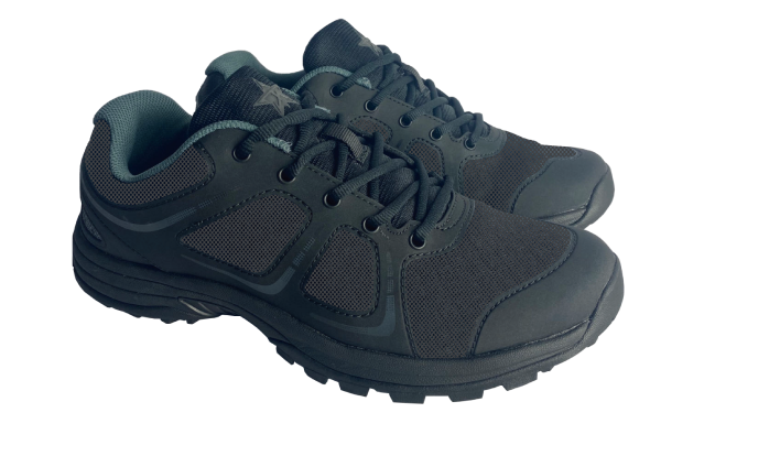 夏季工作鞋采取加強(qiáng)鞋底,具備一定的防穿刺功能。工作鞋樣式為低腰五眼系帶式,前幫由滌綸長絲鞋面布壓燙聚氨酯膠膜制成,后幫為熱塑性聚氨酯成型后包跟,鞋里為滌麻無紡布,大底由黑色發(fā)泡EVA/硬質(zhì)TPU/密實(shí)橡膠組成,幫底采用膠粘工藝,夏季工作鞋設(shè)置網(wǎng)狀透氣工藝。