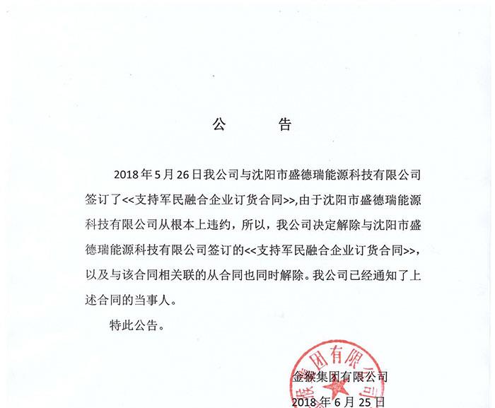金猴集團(tuán)解除與沈陽市盛德瑞能源科技有限公司簽訂的合同