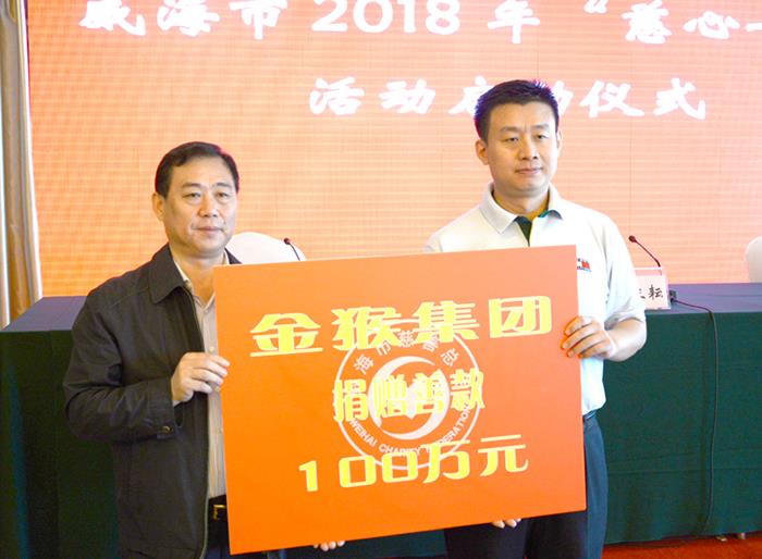 9月19日,威海市2018年“慈心一日捐”活動啟動儀式在東山賓館舉行。集團(tuán)公司董事、副總經(jīng)理岳國威代表全市愛心企業(yè)和個人宣讀了《2018年“慈心一日捐”活動倡議書》,并代表金猴集團(tuán)向市慈善總會捐款100萬元。